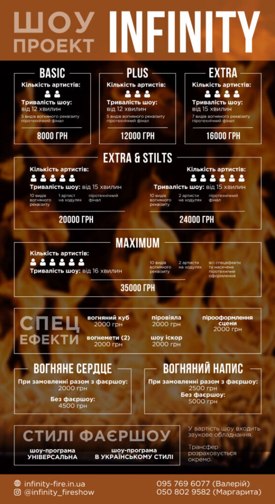 У стандартну програму входить 13 хвилинний виступ артистів з таким вогненним реквізитом (вогняні чаші, напої, снійки, віяла, драгонстафи, дабл стафи) у костюмах під музику та + 1 комплект піротехніки (піропої)